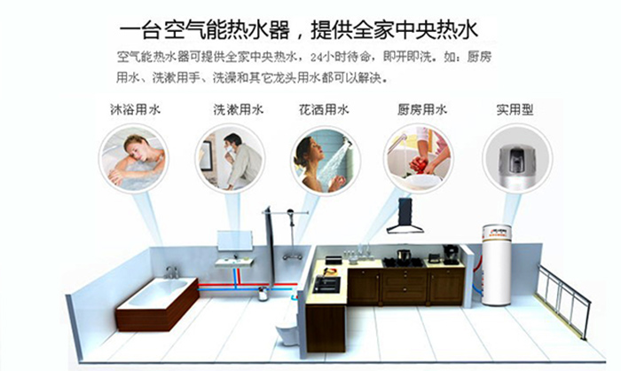 空气(热泵)热水器集供热水、取暖、除湿、降温、空气滤净等各项功能为一体: